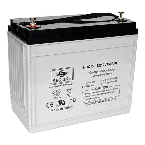 This SEC HDC150-12 12v 150AH Deep Cycle AGM Battery has been designed for cyclic applications, whilst maintaining all the added advantages of starved electrolyte" technology; fast charging, very low gassing, wide temperature range, high capacity per mono bloc, can be operated in any orientation and is offering a Design Life of up to 10 years at 20 degreesC.