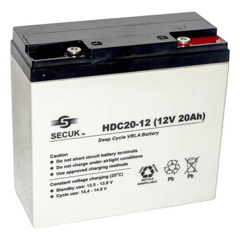 This SEC UK HDC20-12 12v 20AH Deep Cycle AGM Battery has been designed for cyclic applications, whilst maintaining all the added advantages of starved electrolyte" technology; fast charging, very low gassing, wide temperature range, high capacity per mono bloc, can be operated in any orientation and is offering a Design Life of up to 10 years at 20 degreesC.
