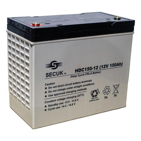 This SEC HDC150-12 12v 150AH Deep Cycle AGM Battery has been designed for cyclic applications, whilst maintaining all the added advantages of starved electrolyte" technology; fast charging, very low gassing, wide temperature range, high capacity per mono bloc, can be operated in any orientation and is offering a Design Life of up to 10 years at 20 degreesC.